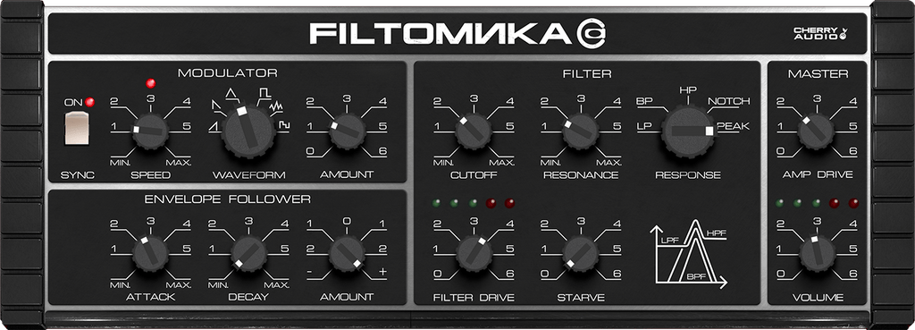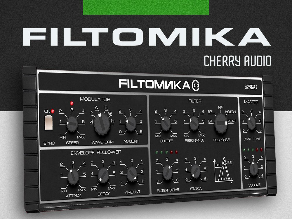 Filtomika is an effect plugin that emulates the wild filter section of the 1980s Soviet Polivoks synthesizer and is based on the expanded multi-mode filter introduced in Cherry Audio's award-winning Atomika virtual instrument. Featuring circuit-modeled DSP designs by the acclaimed developer Mark Barton, Filtomika also includes other methods from Atomika that go beyond the original hardware. These enhancements include an extended selection of waveforms for its syncable modulator, additional filter response modes, and Atomika's unique Starve, Filter Drive, and Amp Drive controls, further expanding its twisted sound palette.With Filtomika, you can process any sound—whether it's drums, guitars, other synthesizers, or even vocals—and achieve the radical, often mysterious sonic results characteristic of Atomika. The plugin features a user-friendly preset browser with over 30 production-ready presets and offers comprehensive MIDI control and DAW automation, complete with intuitive MIDI learn and mapping capabilities. It can be used as an insert or bus effect and is fully compatible with mono and stereo sources. Don't just shape your sound; melt it down with Filtomika.
