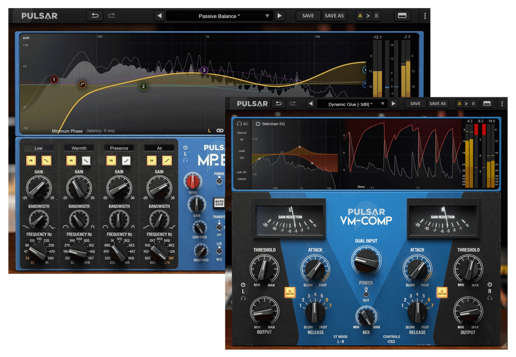 This bundle combines Pulsar’s updated passive equalizer MP-EQ and variable-mu compressor VM-COMP into a complete mastering and mix-bus toolkit. Together they deliver precise tonal shaping, transparent dynamic control, and the analog character of the original hardware designs.