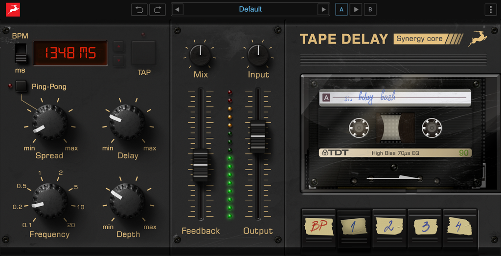 Whether you are using Tape Delay during writing or production sessions, you can lock the delay to the BPM of your project or control the delay manually – in milliseconds or by using the Tap button. If you are after an even wider delay effect, experiment with the Ping-Pong mode. Tape Delay features four switchable tape types allowing you to pick the most suitable vintage color for the instrument or track you’re applying the plugin.