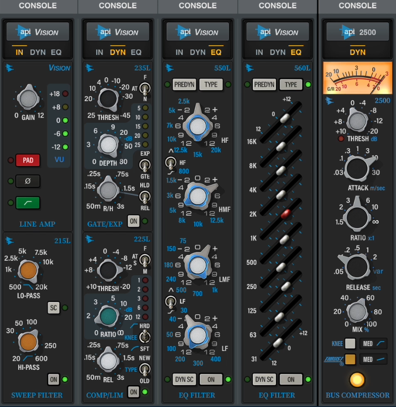 Each channel strip in the API Vision Console Emulation gives you access to six of API's iconic L-Series modules. From the punch and presence of the 212L preamp and colorful 225L compressor and musical 235L gate/expander, to the powerful tone shaping of the 550L/560L EQs and sweepable 215L Hi and Lo pass filters, you can sculpt with bold API tone — in real time.