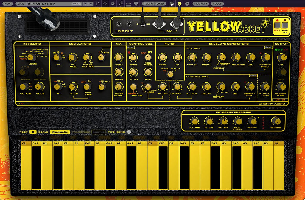 Yellowjacket synthesizer is a stunning value-packed tribute to the venerable Wasp synthesizer, released by the British synth company EDP in 1978. Cherry Audio has reproduced the singular buzzy tone and drone of this legendary monophonic, digital/analog hybrid, from its quirky oscillators to its distinctive filter. Further influenced by the pioneering spirit of its inventors, we've added several innovative features to Yellowjacket, reenvisioning what could have been. These include elements of other EDP instruments, unison and 16-voice polyphony, emulation of the Wasp's integrated speaker, an expanded multimode filter, and a new-to-Cherry advanced arpeggiator with probability and humanise controls.Cherry Audio has replicated the look of the notorious touch-capacitive yellow and black keyboard of the original, enhanced it with diatonic scales and transpose, and extended it with customizable pressure control with support for expressive channel and polyphonic aftertouch. Perhaps the most exciting feature of Yellowjacket is directly inspired by EDP's innovative pre-MIDI system that allowed multiple synths to be chained together: multi-voice modes that add adjustable "mini synths" that can provide subtle or extreme variation in tone, single-fingered chords and arpeggiated patterns, lush stereo effects, and more.